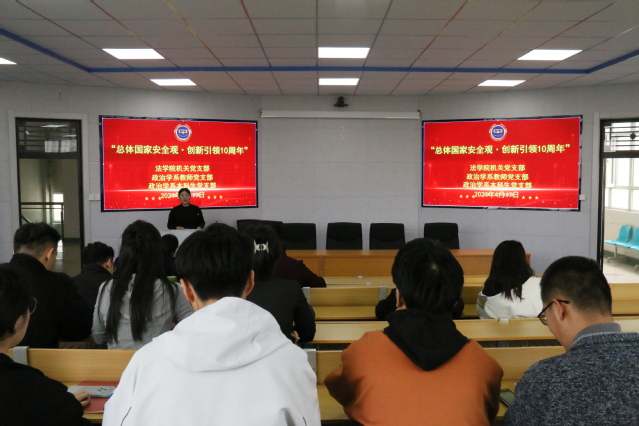 政治学系党支部书记段会平副教授以“总体国家安全观·创新引领10周年”为题讲专题党课。段会平从国际安全与国家安全战略、总体国家安全观形成的时代背景、总体国家安全观发展脉络与核心要义,深入贯彻总体国家安全观的主要任务进行过了讲解。